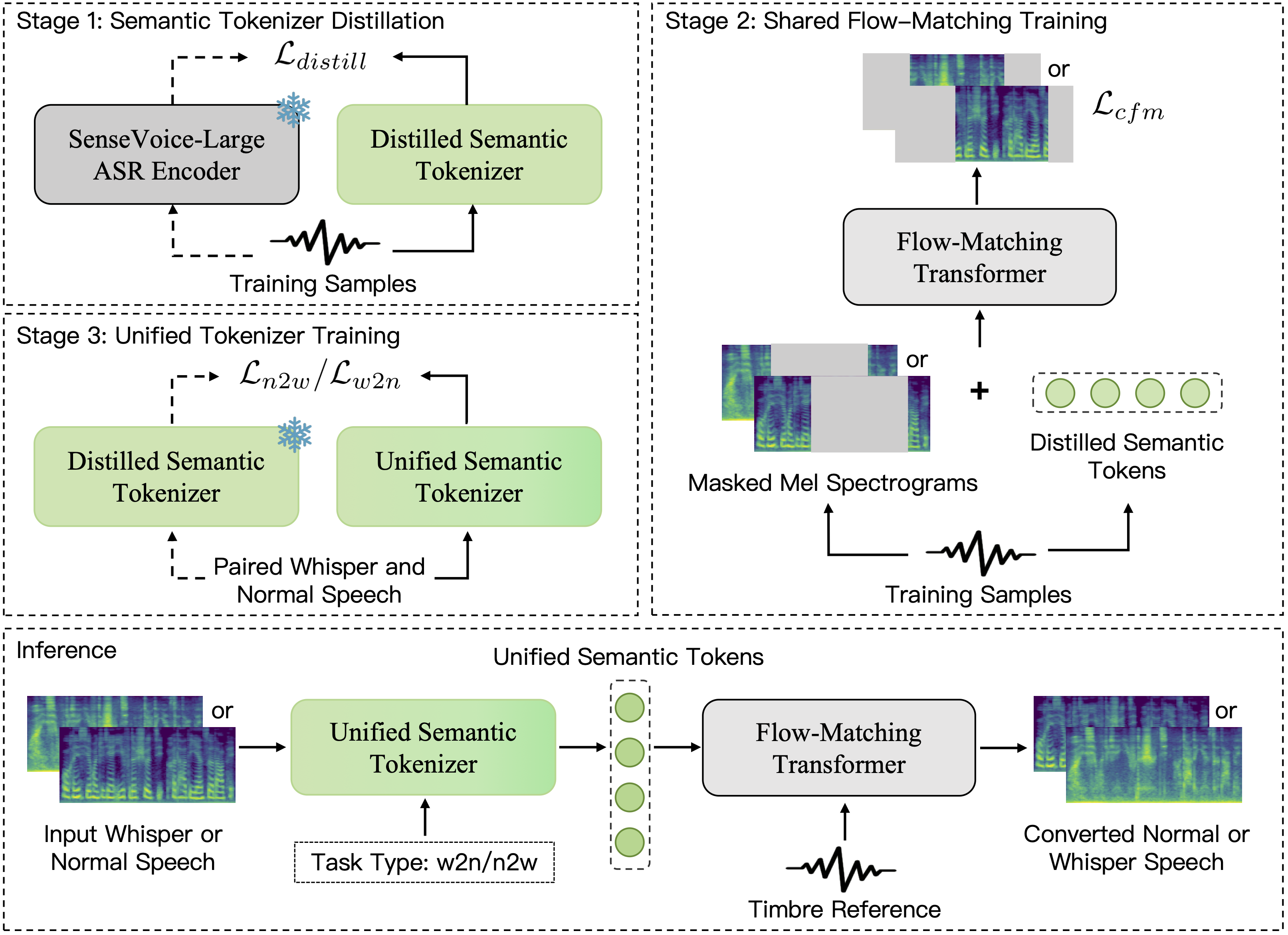 | Whispered Input | Normal GT | Reference Text | WESPER | MaskCycleGAN | CosyVoice2 | WhispEar(Ours) |